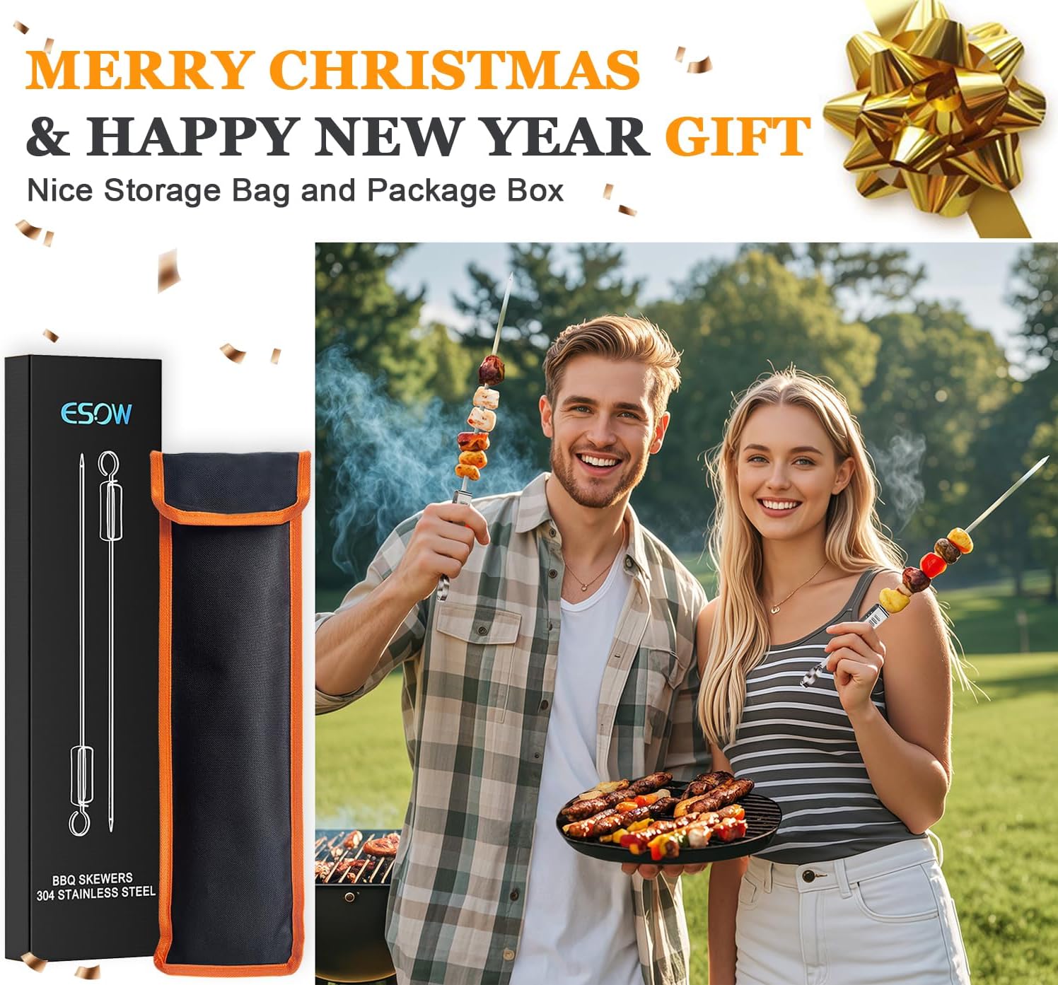 - FRIENDLY CUSTOMER CARE: Our stainless-steel skewer sticks are backed up by our ESOW manufacturer 30-day money back guarantee with 1-year free replacement warranty; The 8-piece set comes in a nice gift ready box with convenient storage bag. Perfect Gift for Grill Lovers!