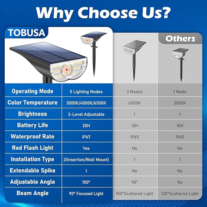 - 【𝟮𝟬𝟮𝟰 𝗨𝗽𝗴𝗿𝗮𝗱𝗲𝗱 𝗥𝗲𝗱 𝗜𝗻𝗱𝗶𝗰𝗮𝘁𝗼𝗿 𝗟𝗶𝗴𝗵𝘁】 Driven by customer-oriented values, TOBUSA kindly set aside an indicator light at the middle for each led solar landscape spotlights. The light keeps flashing in red when the solar spot lights are under charging and auto off after charging completed. This smart design provides necessary convenience for our customer to track on the status of the solar battery