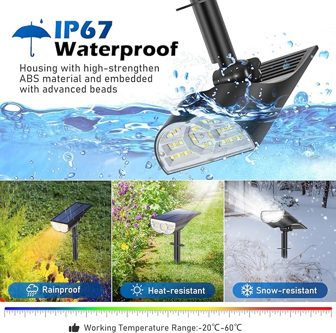 - 【𝗦𝘁𝘂𝗿𝗱𝘆 𝗦𝗼𝗹𝗮𝗿 𝗟𝗶𝗴𝗵𝘁𝘀 𝗳𝗼𝗿 𝗢𝘂𝘁𝗱𝗼𝗼𝗿&𝗜𝗣𝟲𝟳 𝗪𝗮𝘁𝗲𝗿𝗽𝗿𝗼𝗼𝗳】 Housing with sturdy ABS material and covered by tightly sealed clear lens, our solar powered garden lights withstand all kinds of extreme weathers like heavy rain, intense heat, severe cold, frog or frost. Working temperature ranges from -20℃-60℃. Coupled with IP67 waterproof high rating, our outdoor solar spotlights are able to secure your outside garden pathway patio landscape all year round with bright lighting ambience, no delay or flicker