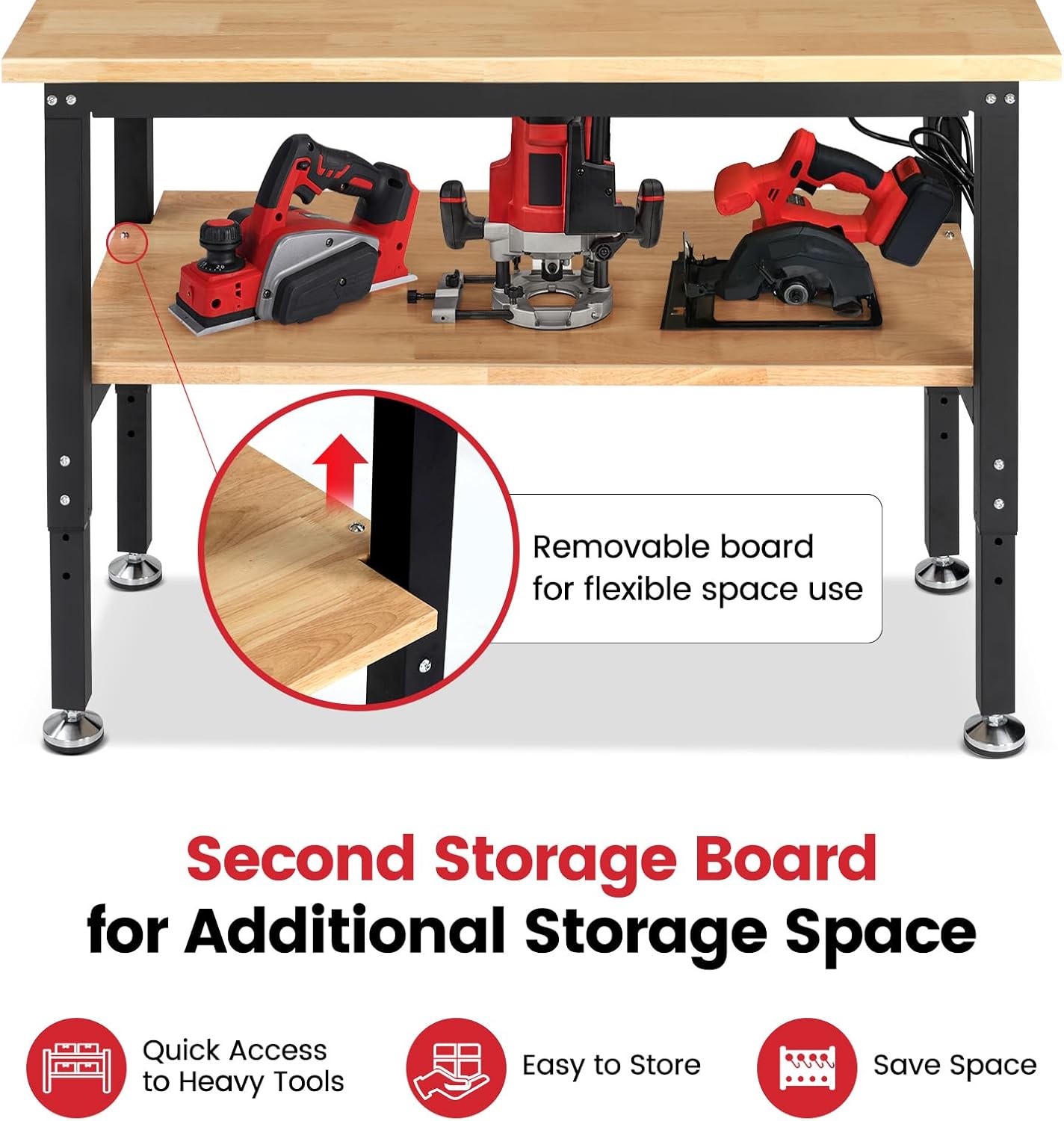 Adjustable Height Work Bench 48 x 20 Workbench for Garage Work Table with Under Table Shelf for Shop Woodworking, Heavy Duty Rubber Wood Top for Office, Home, Commercial