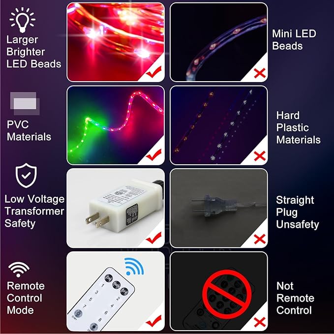 - 8 Function & Remote Control: The Christmas tube lighting LED lights has 8 light modes, 4 levels of brightness, 3 levels timing function and memory function, remember your last mode when you turn it on again, no need to reset every time, these functions can be set by remote control.