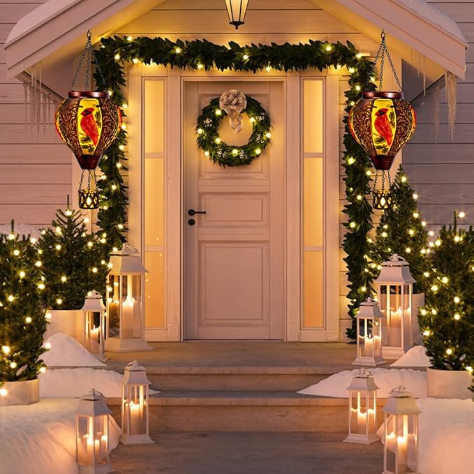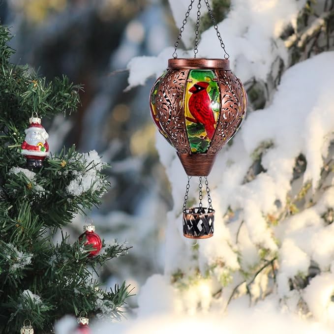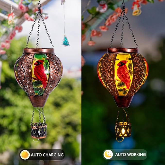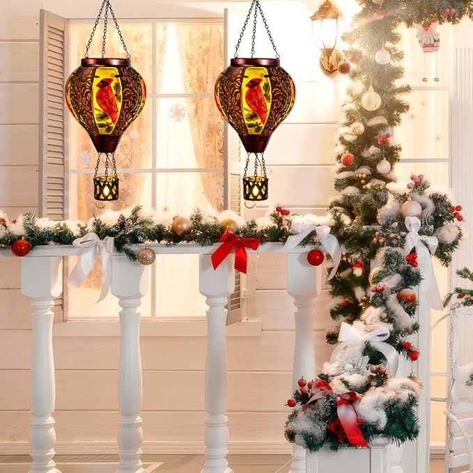 - 【Cardinal Decor】Bring the beauty of nature into your yard with this captivating cardinal hot air balloon solar lantern. Crafted with intricate details, it features a vibrant red cardinal perched amidst lush pine branches and golden accents. Suspended by elegant chains, this solar hot air balloon lantern with flame casts a warm, inviting glow at night.