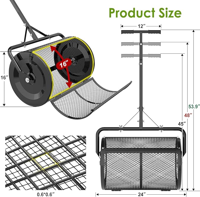 - 【Premium Material】The Seeutek compost spreader adopts all-high-quality steel structure, which is sturdy and durable. Roller measures 15.8" diameter x 24" length, and the metal mesh finish is powder-coated and heat-treated to resist rust and corrosion. Plus the ergonomic rubber T-handle is non-slip and comfortable