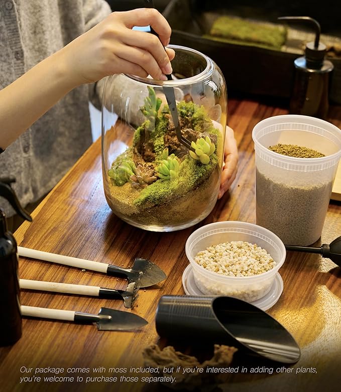 - Included Components : terrarium jar, potting soil, garden gravel, clear sand, live moss, plant mat, 2 shovels, rake, spray bottle, scoop, stainless steel tweezers, brush, 4 pieces of driftwood, 6 landscape stones, 2 decorative ornaments, grow light terrarium jar, potting soil, garden gravel, clear sand, live moss, plant mat, 2 shovels, rake, spray bottle, scoop, stainless steel tweezers, brush, 4… See more