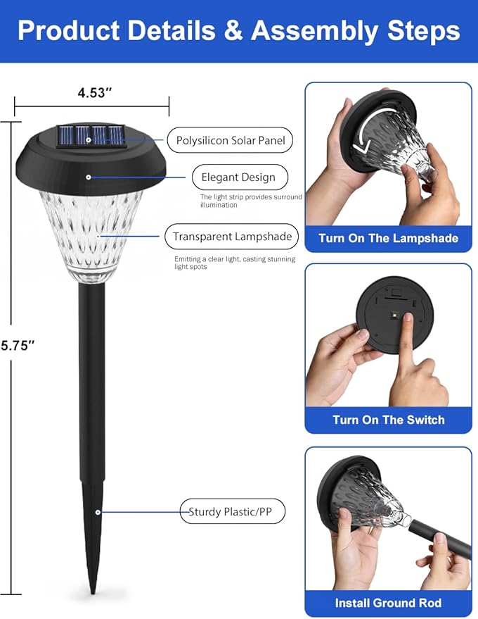 - Easy and Quick Installation:With our simple assembly process, you can easily install the outdoor solar lights in just a few minutes. If the soil is too hard, simply moisten it or dig a small hole before installation. It's that easy!