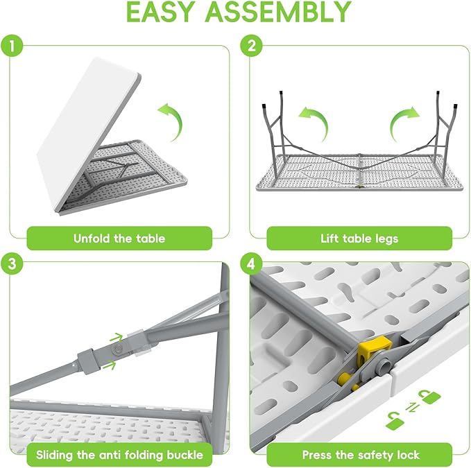 - High-Quality & Sturdy: Constructed with premium HDPE material and reinforced steel legs, our 6 ft folding table can hold up to 300 pounds, ensuring long-lasting stability and durability