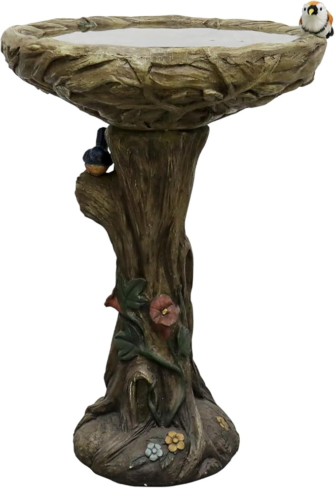 SunJet 25.5 Inch Heigh Wood-Look Concrete Bird Bath with Decorative Faux Bird – birdbath Rustic & Long-Lasting Design, Enhances Garden, Patio, Yard, Lawn Décor