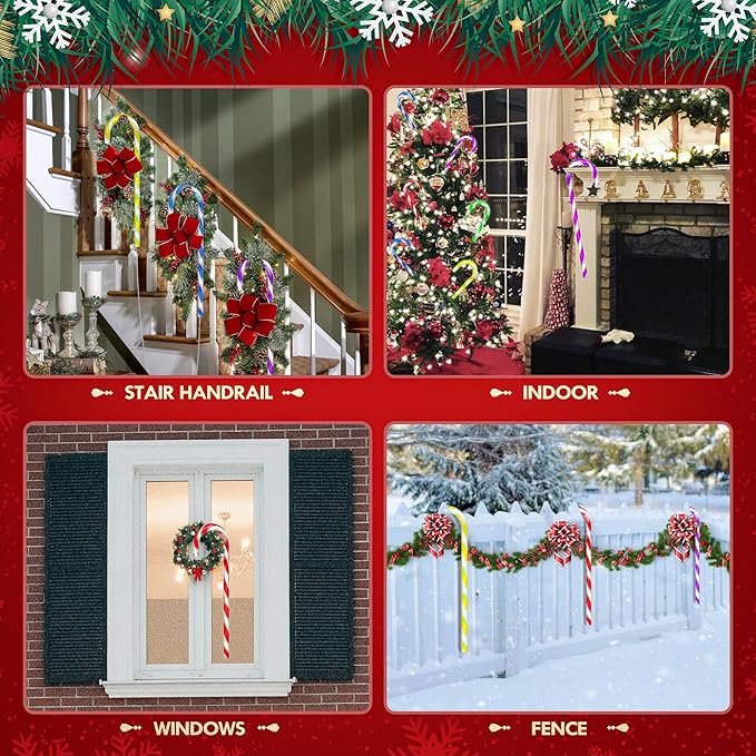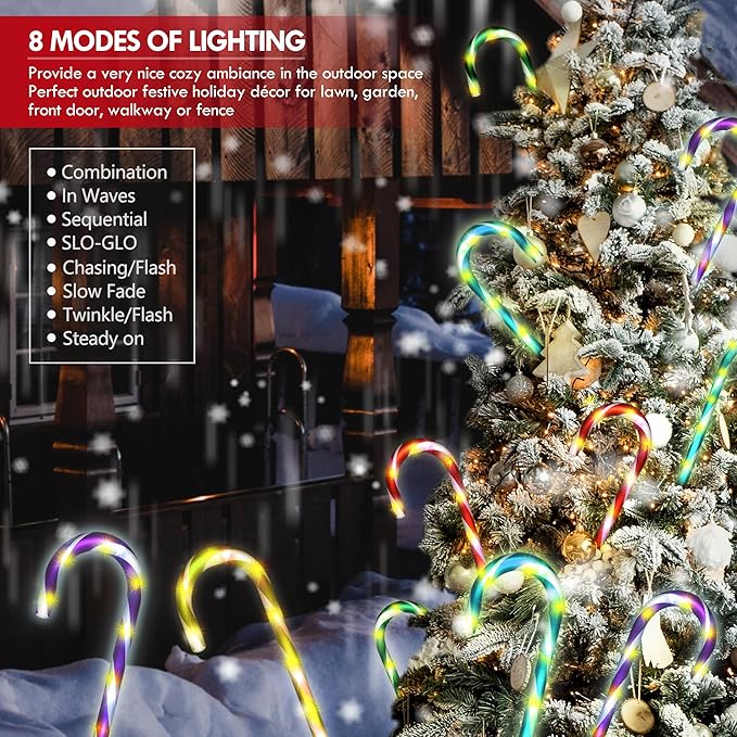 - 【Larger Size Christmas Candy Cane Lights -21 Inches】 With a total length of 21 inches including the stake, these candy cane lights are larger and taller than other products on the market. The set includes 10 candy cane lights, making installation easier. Some sellers claim to offer a 10-pack, but they require connecting 2 sets of 5 candy canes together, which can be unsafe and inconvenient. Our 10-pack with 8 lighting modes provides flickering and decorative lights, saving you time and effort.