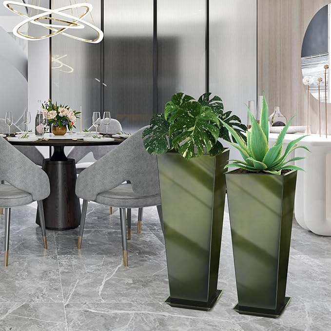 KOL 25'' & 28'' Tall Bright Glazed Planter with Insert, Set of 2, Galvanized Steel Planter Metal Pots with Drainage Hole for Indoor & Outdoor Use, Decorative Plant Pots for Front Porch, Patio - Green