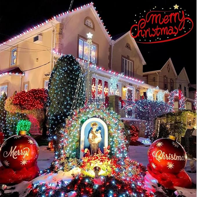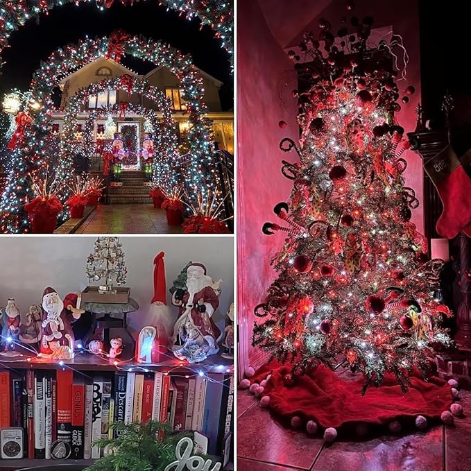 - Brilliant Outdoor Christmas Decor: 4 Pack each 100 LED starry-style solar christmas lights with red and white light accent your space with a unique, inviting glow. Each lights with 33ft length is perfect to put around a garden or porch railing.Blue&White solar lights were the finishing touch for a back yard bbq, party, wreath, fence, patio, pools, bush, holiday, indoor, outdoor. In the dark, the wire fades to invisible, leaving only the fairy lights, create a classy and romantic atmosphere.