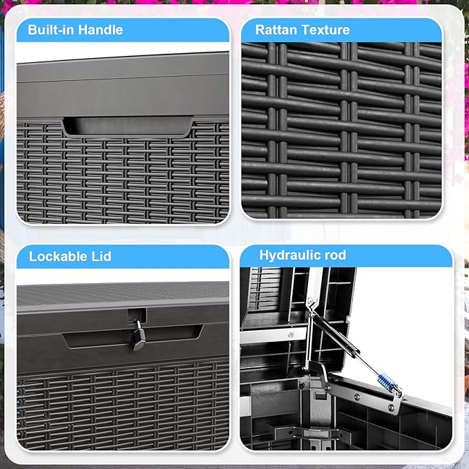 - Safety design: Each deck box has lockable holes (not included) for added security; in addition, the box is equipped with a hydraulic stand, which allows easy opening and slow closing and prevents hand pinching. The outdoor waterproof deck box has built-in handles on both sides, ensuring easy grabbing and moving