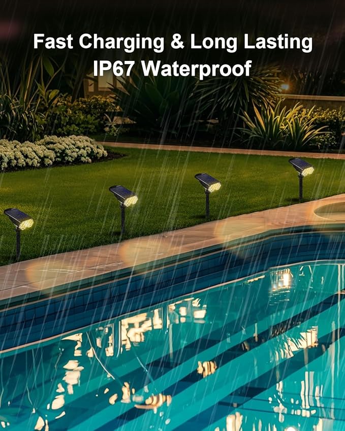 - 💦𝐀𝐝𝐯𝐚𝐧𝐜𝐞𝐝 𝐖𝐚𝐭𝐞𝐫 𝐑𝐞𝐬𝐢𝐬𝐭𝐚𝐧𝐜𝐞, 𝐄𝐧𝐝𝐮𝐫𝐢𝐧𝐠 𝐒𝐭𝐫𝐞𝐧𝐠𝐭𝐡:The solar powered spotlights feature an integrated, exquisite design that outperforms split-type solar lights, especially in harsh weather conditions like storms, showcasing superior waterproof capabilities. Crafted with durable ABS material and equipped with a 2000mAh high-capacity battery, our fixtures provide a long-lasting and reliable lighting experience for your outdoor spaces.