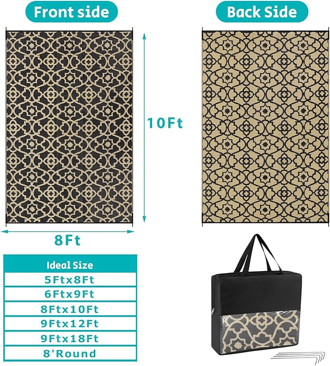 • Versatile Outdoor Carpet: The indoor outdoor plastic rugs have multiple choice in different colors(4'x6',5'x8',6'x9',8'x10',9'x12',9'x18',8'round), is ideal for a variety of indoor outdoor activities,like patio mat, deck rug, garden rug, beach mat, picnic mat, BBQ party mat, rv camping rug,pool rug,outdoor doormat,garage rug,front door mat,allowing you to have plenty of imaginable space for more fun.