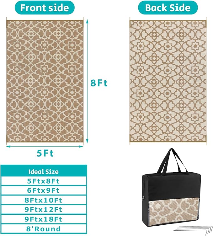 - Versatile Outdoor Carpet: The indoor outdoor plastic rugs have multiple choice in different colors(4'x6',5'x8',6'x9',8'x10',9'x12',9'x18',8'round), is ideal for a variety of indoor outdoor activities,like patio mat, deck rug, garden rug, beach mat, picnic mat, BBQ party mat, rv camping rug,pool rug,outdoor doormat,garage rug,front door mat,allowing you to have plenty of imaginable space for more fun.