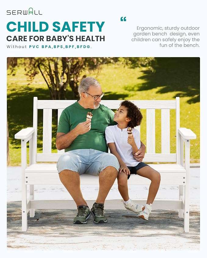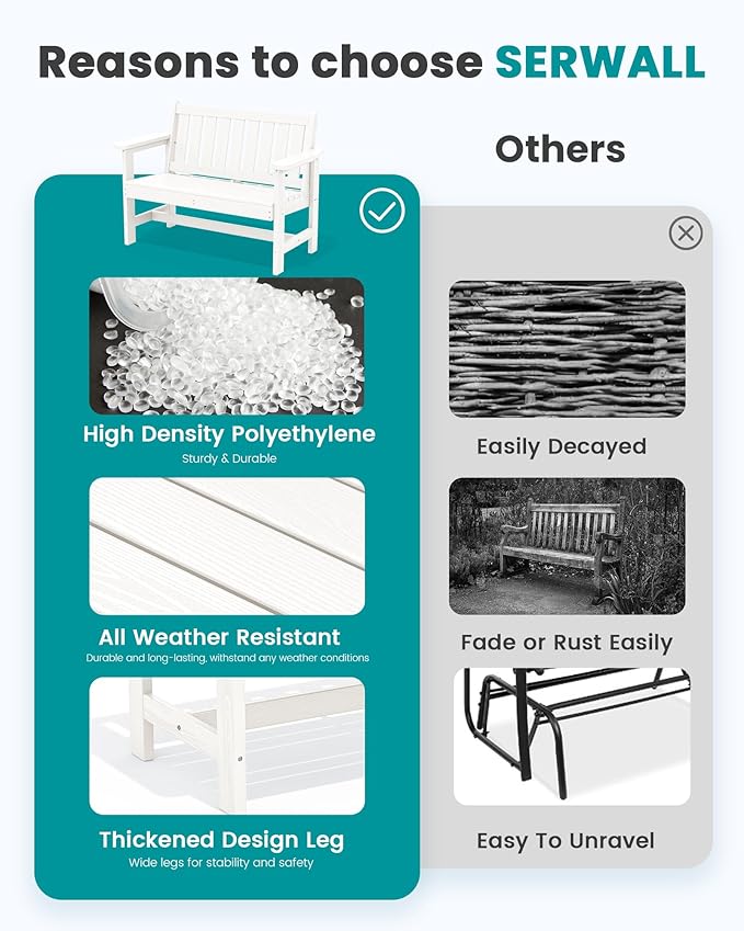 - All-Weather Resistant: The SERWALL garden bench is made of durable high-density polyethylene (HDPE), along with 304 stainless steel hardware, making it resistant to various weather conditions and ensuring long-lasting durability. It is an ideal choice for any outdoor environment.