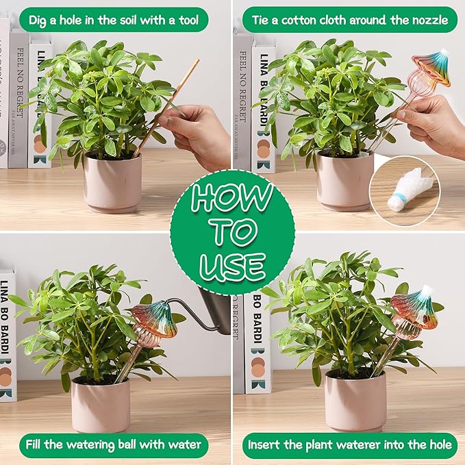 - Easy to Use:The water bulbs for indoor plants have an open design at the top, making it easy to add water. You just need to dig a hole near the plant system, insert the plant watering ball into the hole, add 80% water, and cover it with a rubber stopper