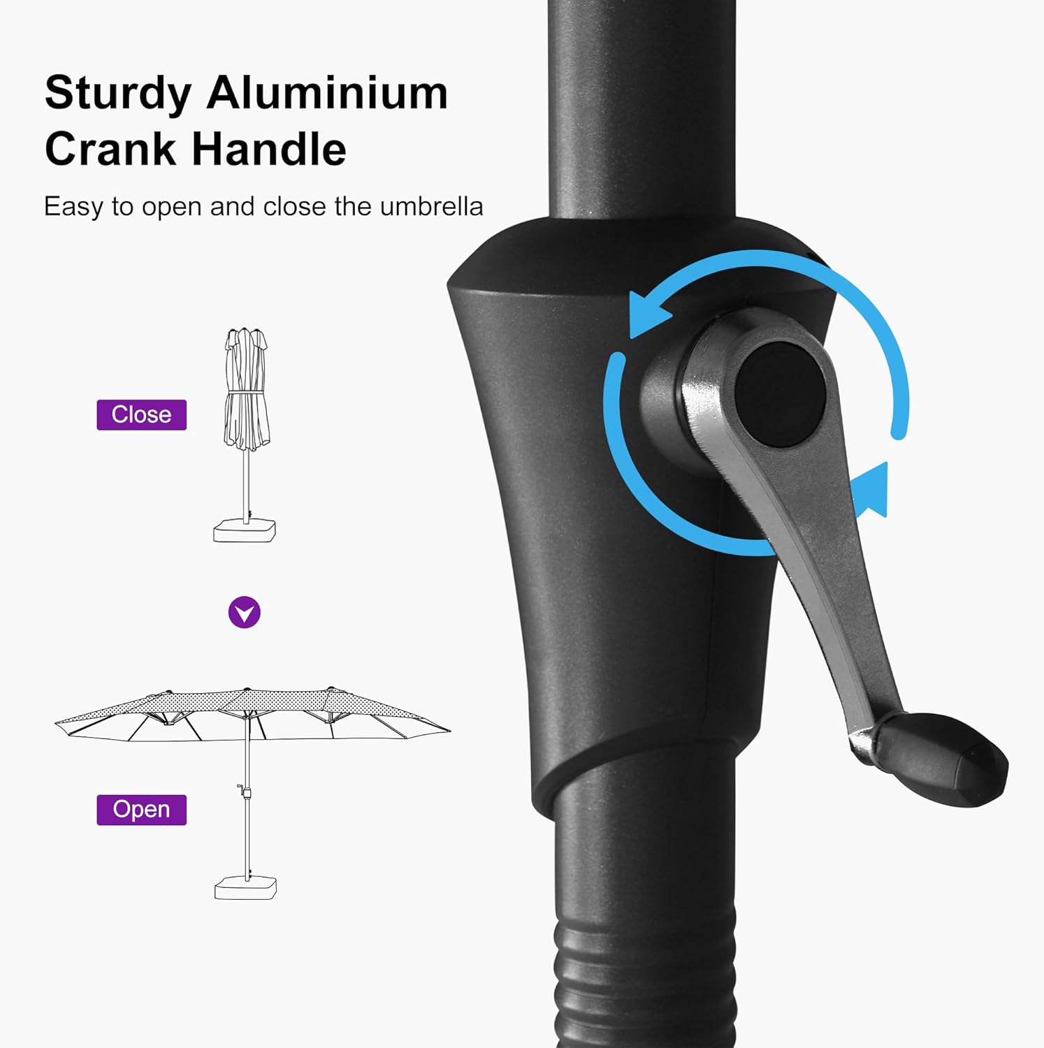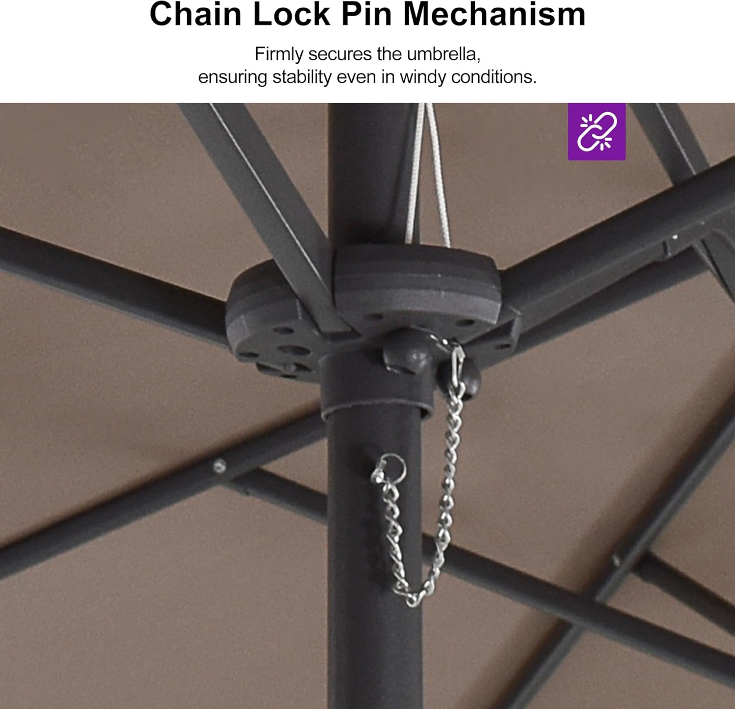 - Crank Design: The simple crank lifting system is equipped, enabling the convenient and rapid opening and closing of the patio umbrella. Additionally, an advanced chain lock pin is provided, ensuring the stability of the umbrella even in windy conditions