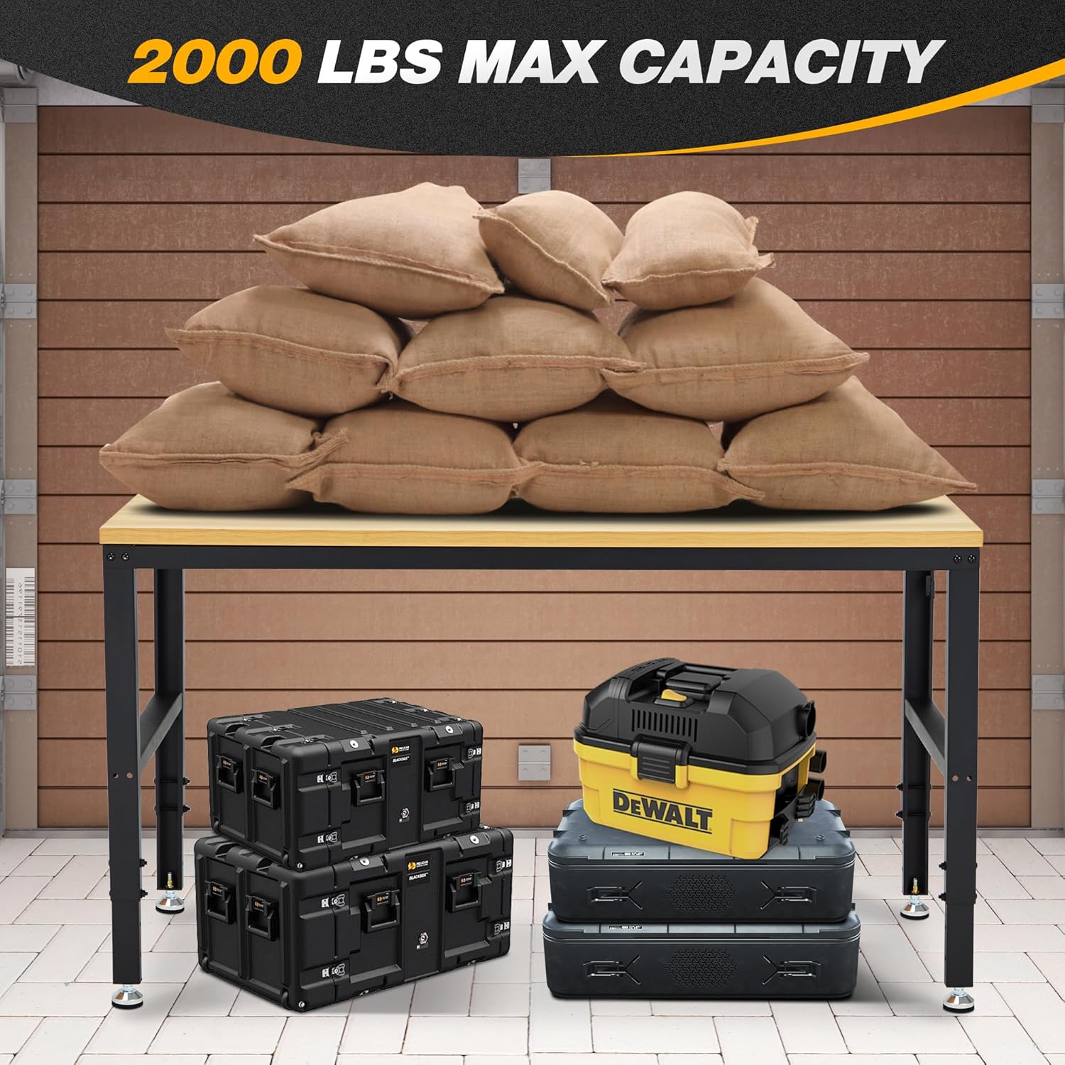 60” Adjustable Workbench,Heavy Duty Wood Work Bench 2000 Lbs Load Capacity,Work Table with Power Outlet for Garage, Workshop, Office, Home