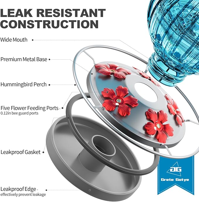 - đ§LEAKPROOF FUNCTION: Built-in durable gasket, unique design makes base connection proper and seamless, even when the hummingbird feeders for outdoors hanging are shaken by wind or birds perching on it. After filling the container and screwing it onto the base, flip it over and hang it on a tree/deck hook/shepherd's hook/hangers/window hook.