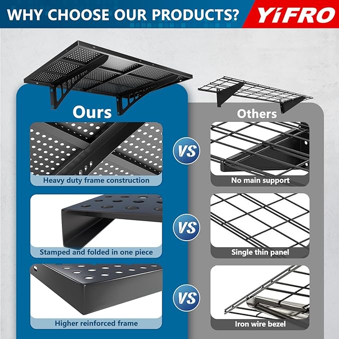 - ADJUSTABLE SPACING: YIFRO garage wall shelves is suitable for any wood post spacing, including standard 16'/18'/24'/32' spacing for installation.