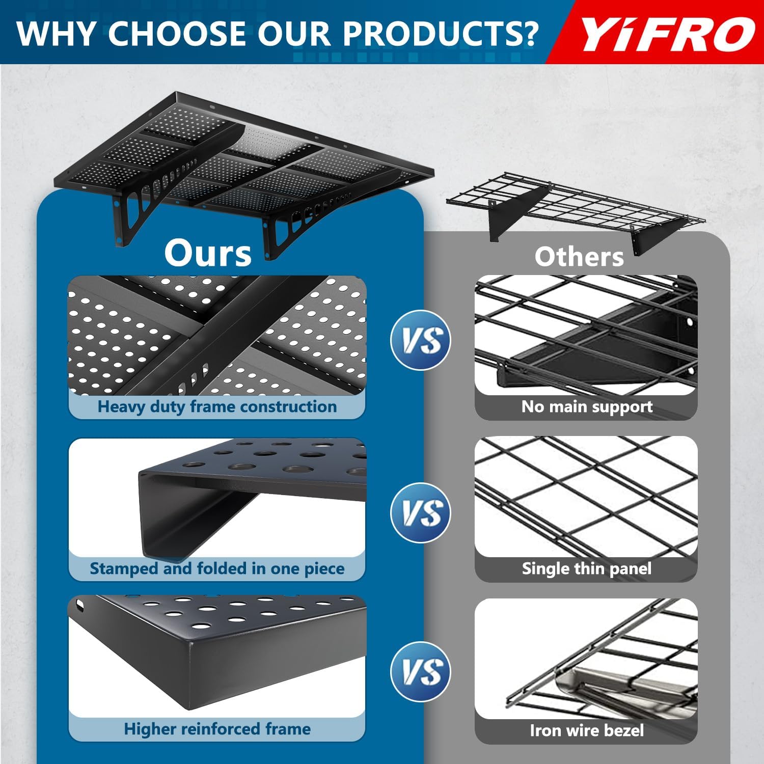 - HEAVY DUTY CONSTRUCTION: YIFRO garage wall shelving takes its cues from architectural frame construction, with a 2x3 ft individual bracket load capacity of 250 lbs. and a total of 1000 lbs. for 4 shelves, which makes it easy to store most of the items in your garage.
