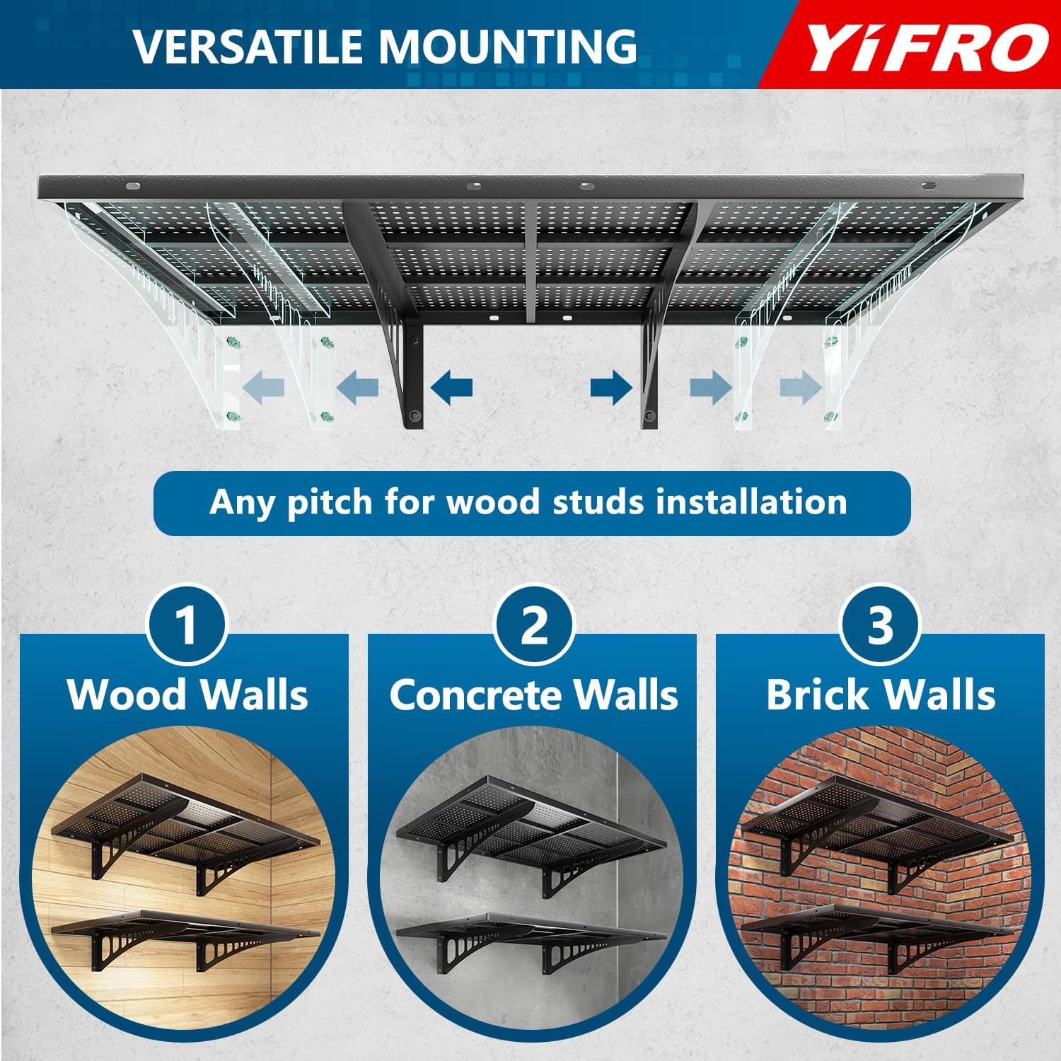 - ADJUSTABLE SPACING: YIFRO garage wall shelves is suitable for any wood post spacing, including standard 16'/18'/24'/32' spacing for installation.