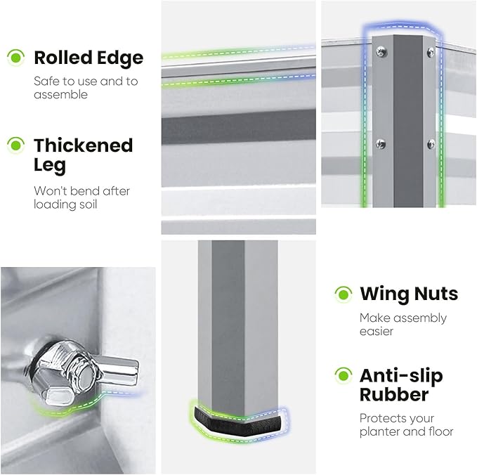 - 【Sturdy & Durable, Capacity: 250 lbs】Our galvanized steel planter raised bed is rust-resistant, sturdy, and can support up to 250 lbs. More durable than wooden raised garden bed kit, it ensures a longer lifespan without the worry of cracking or warping.