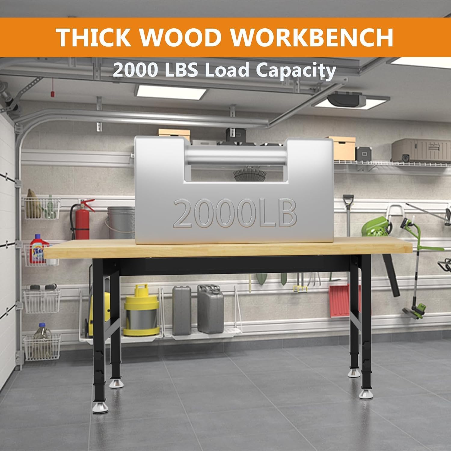 60" Work Bench, Adjustable Height Workbench, Heavy-Duty Thicker Work Table, 2000 LBS Load Capacity Workstation for Garage, Workshop, Office, Home