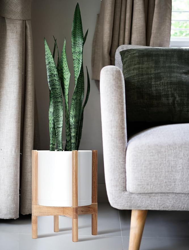- A Complete Set: Minimalist plastic planter, combined with a sculptural, solid wood stand that match perfectly together and looks great in any home.