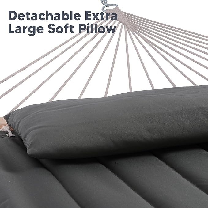 - Comfortable and Non-fading: Two-layer quilted polyester fabric with poly fiber filling which is cozier, best for camping and outdoor activities. Compared with other quilted hammocks, it will not fade after long-term usage. A polyethylene-stuffed head pillow offers superior comfort