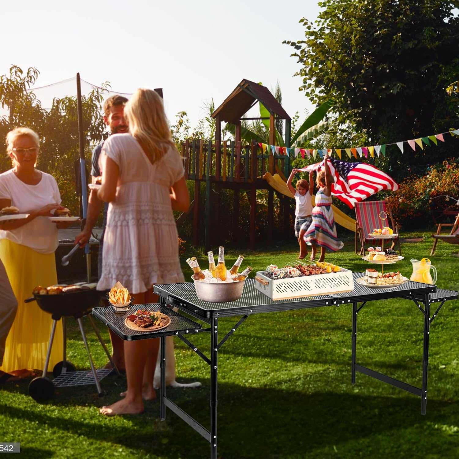 Grill Table Folding Table with 2 Wing Panels 4FT+1.77 FT with Mesh Desktop 3 Height Adjustable Portable Grill for Outdoor Indoor Beach BBQ Picnic Travel RV Black