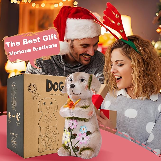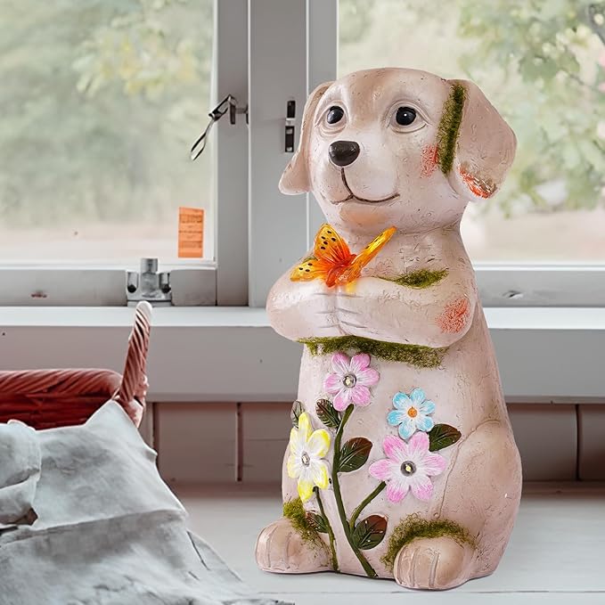 Solar Dog holiding Solar Butterfly Lights - Resin Garden Outdoor Decorations for Patio,Balcony,Yard,Birthday Garden Gifts for Women Mom