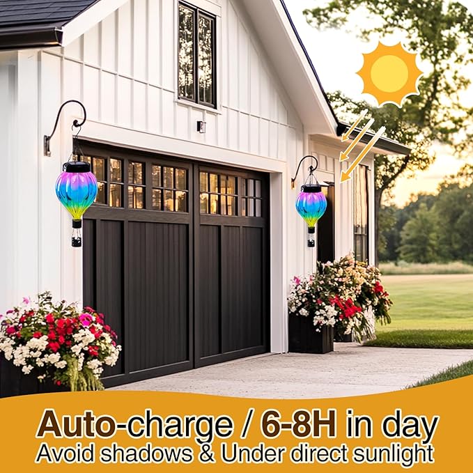 - 【Eye-Catching Design】This solar-powered hot air balloon lantern is made of glass and metal,featuring a vibrant gradient design on the glass surface that shines brilliantly under sunlight.Equipped with a chain hook,this lantern allows you to decorate porches,gardens,trees,gazebos,or any other location of your choice.