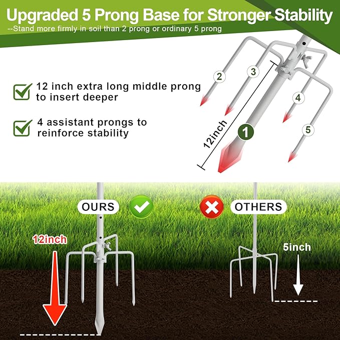 - Rock-Solid Stability, From Soft Soil to Hard Soil:Features a unique 5-prong base with an extra-long 12" center spike and 4 side prongs, this upgraded design keeps your hummingbird feeder pole stable - even in loose or sandy ground. No more tipping or wobbling in your outdoor garden,yard or flower beds.