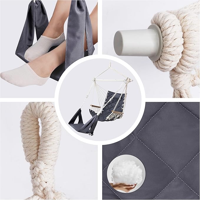 - 2️⃣ Unique Design in Quilting-Rooity hammock chair new upgraded design is with fabric quilting process, which is filling with airtouch padding fibers inside. Much more ergonomic with overall back raised , for great support to hold your back and makes more confortable as well. 1.2" thickened wooden armrest reduce pressure points by 40% vs basic models, with breathable polyester fabric for all-day comfort.