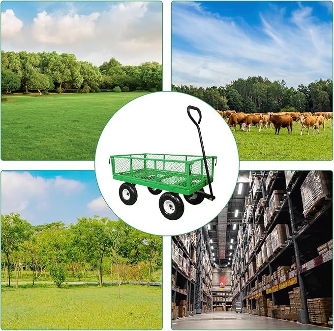 AAIN 600 lbs Metal Garden Cart,Heavy Duty Garden Wagon with Removable Steel Mesh Sides, Utility Yard Cart with 180° Rotating Handle and 10-inch Wheels—Perfect for Gardens, Farms, and Yards, Green