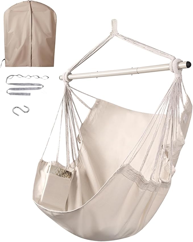 - Durable and Comfortable Fabric: Made with Eco-friendly cotton thread, the hanging hammock chair offers a soft, sponge-like texture for ultimate comfort. Perfect for lounging for hours, it provides a relaxing experience for both adults and children, whether you’re reading, napping, or simply enjoying the day