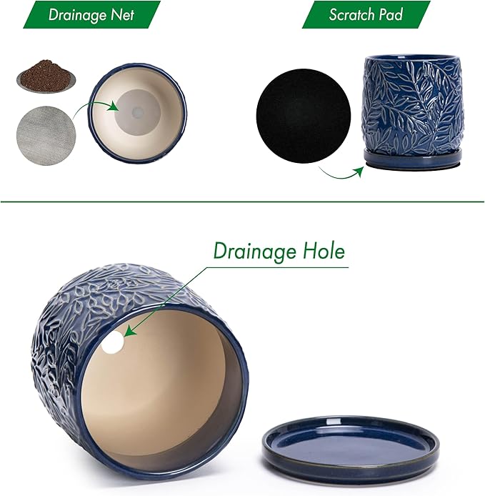 - Drainage Hole and Saucer: Each pot comes with pre-drilled drainage hole and matching ceramic tray to drain excess water.