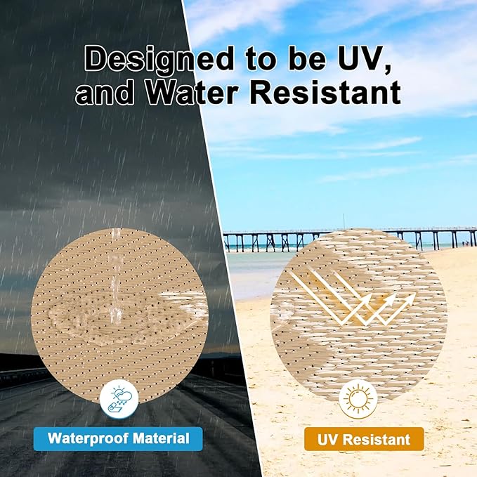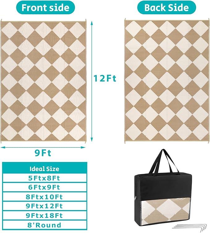 • Versatile Outdoor Carpet: The indoor outdoor plastic rugs have multiple choice in different colors(4'x6',5'x8',6'x9',8'x10',9'x12',9'x18',8'round), is ideal for a variety of indoor outdoor activities,like patio mat, deck rug, garden rug, beach mat, picnic mat, BBQ party mat, rv camping rug,pool rug,outdoor doormat,garage rug,front door mat,allowing you to have plenty of imaginable space for more fun.