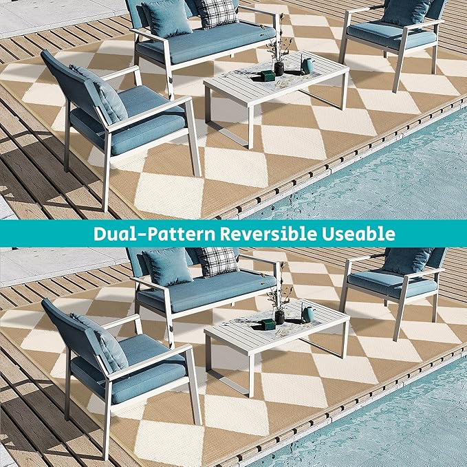 • Reversible Outdoor Rugs: Featuring a classic moroccan pattern on both sides, this rectangular 9x12 ft outdoor area rug allows you to instantly refresh your patio, porch, backyard, deck, RV campsite. And this outdoor deck rug is reversible, two-sided design allows you to have two different looks,both sides can blend perfectly with nature and look very full and comfortable.