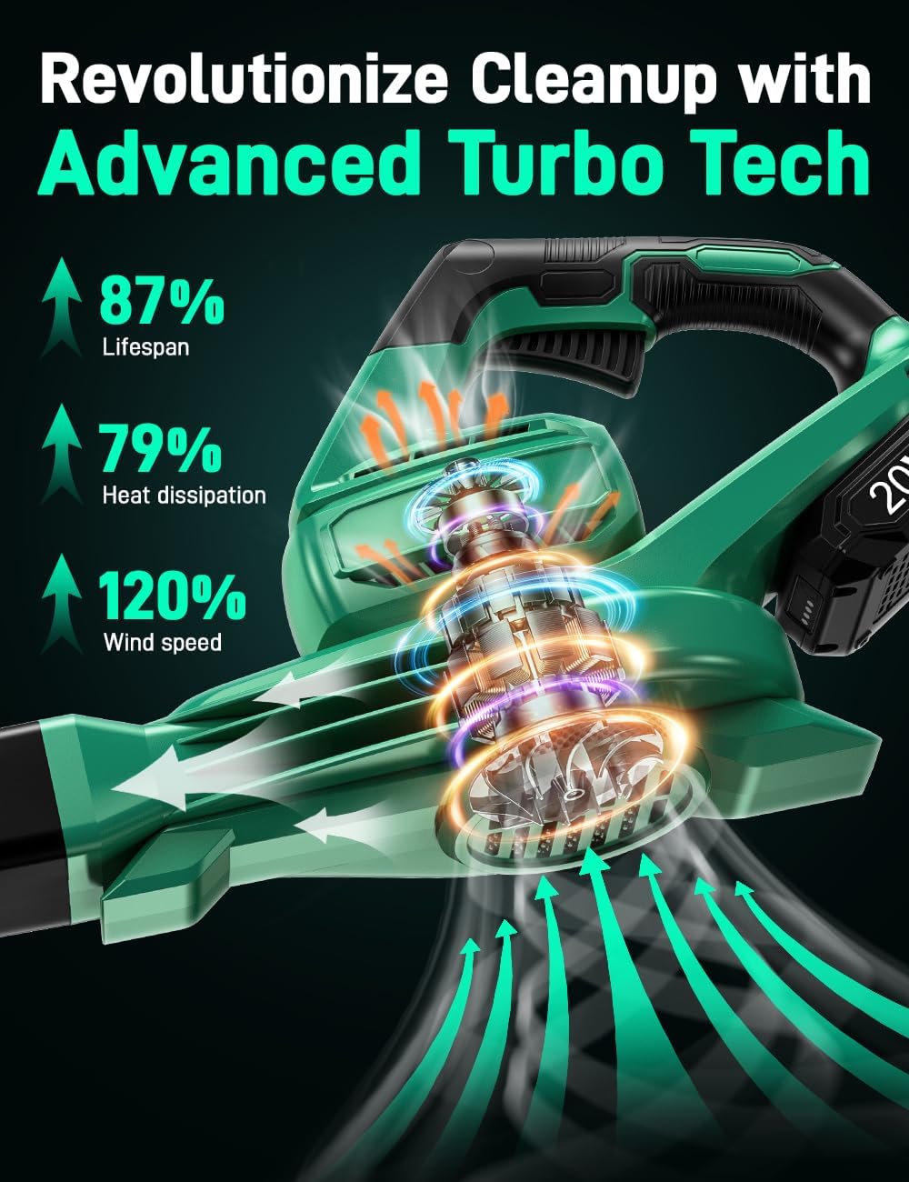 - 🍁【Upgraded Turbine Tech】Thanks to the latest motor and upgraded turbocharging technology of Kimo leaf blower cordless with battery and charger, realizing 170 MPH blowing speed and 240 CFM air volume within this battery operated blower. Enjoy the joy of strong boosting power instantly. Besides, the cellular radiator on the bottom of the rechargeable leaf blower greatly reduces the risk of overheating, providing a more safty and durability for you.