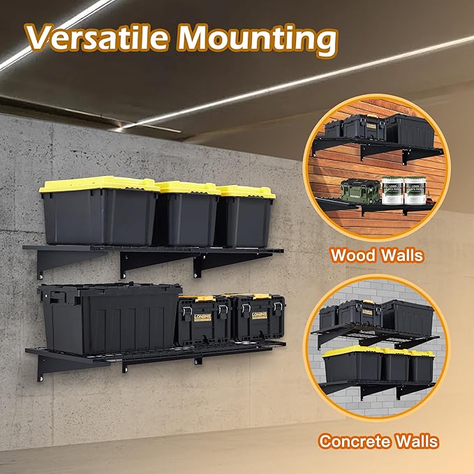 - Easy to install: metal garage wall shelves are designed with a modular assembly design; One person can easily install.Simply place the hole positioning paper, install the bracket, tighten the screws, and the installation is complete; Attention: The garage storage shelves only supports installation on concrete walls and wooden panel walls; Compatible with different joist spacing; Installation can be done with spacing of 16”, 18”, 24”