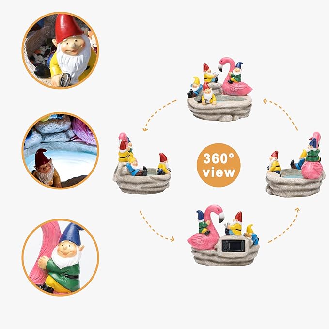 - 【CUTE GARDEN STATUE】Yiosax solar gnome statue can be decorated in the garden,lawn.balcony,backyard,pool,patio,this solar powered figurine is made up of four adorable gnomes sitting and playing by the pool with one gnome statue sitting on a flamingo.can fill your outdoor space with a joyful and happy atmosphere,it also doubles as a bird feeder
