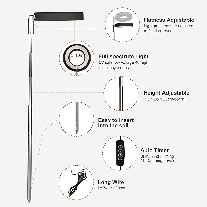 - 📏 Space-Saving Adjustable Height - Telescopic arm (8"-26") fits tabletop planters, shelf gardens, or hanging pots, positioning the grow light at ideal PAR distance for each plant type