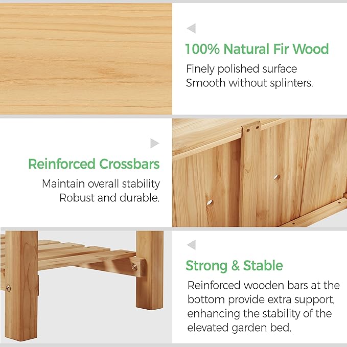 - Solid Fir Wood: The raised garden bed is made of non-painted fir wood, known for its strength and stability. The thick solid boards are polished with smooth surfaces and no burrs or wood splinters