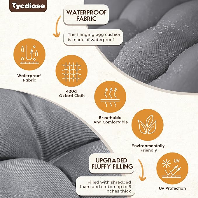 - đăWATERPROOF FABRICă-Tycdiose egg chair cushion is made of waterproof, UV-resistant Oxford fabric, which is soft and skin-friendly, durable and suitable for indoor outdoor patios, garden porches and sunrooms. Note: If rainwater stays on the 3D seams (grooves) of the egg chair cushion for a long time, it may seep in and wet the egg chair cushion.