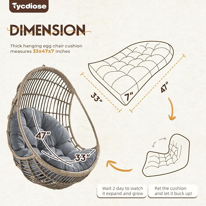 - đăWARM TIPSă-The cushions for hanging egg chair are vacuum compressed packaged. After opening, our waterproof egg chair cushion will be wrinkled for a short time that is a normal phenomenon. Please be patient to leave it for 3-7 days to recover the original shape.
