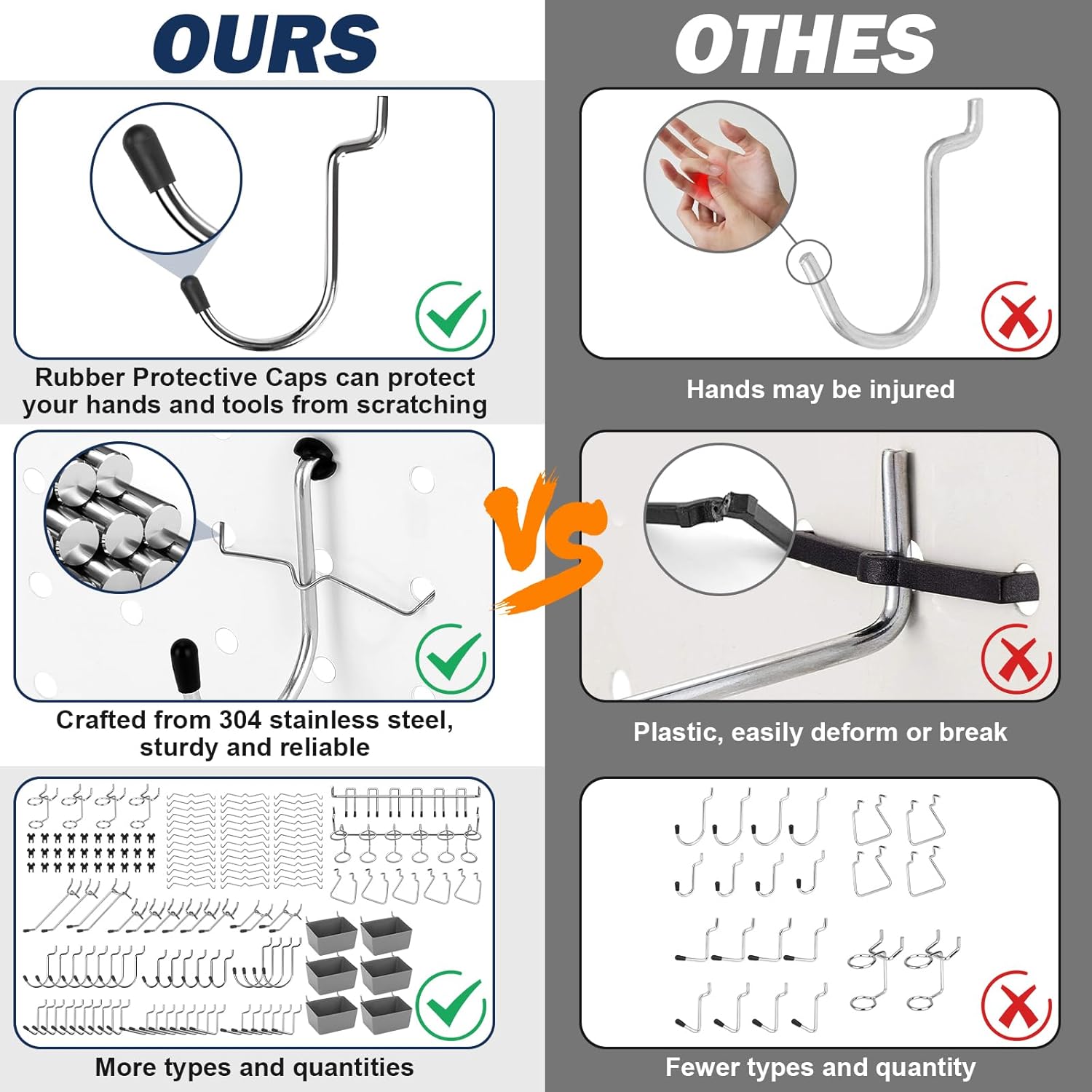 - Robust Durability & Premium Quality: Engineered with top-grade 304 stainless steel and high-quality silicone, our pegboard accessories ensure every peg board hook and peg hook is built to last, offering unmatched durability and rust-resistance for your pegboard wall organizer.