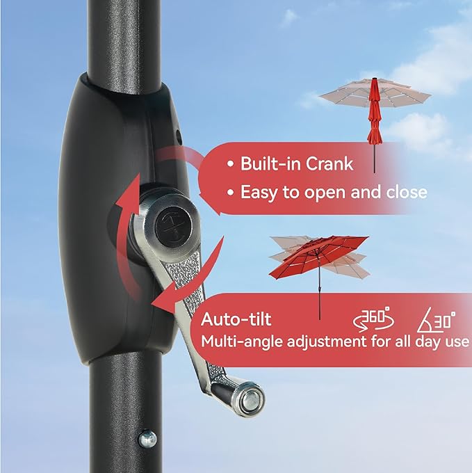 - Easy to Adjust: This umbrella Outdoor patio is designed with crank opening system and easy to adjust, it can be easily opened, closed and tilted from 0-45° through the hand crank adjustment, which is easy and quick to use, and it can provide more angle of shade protection and better shading effect.