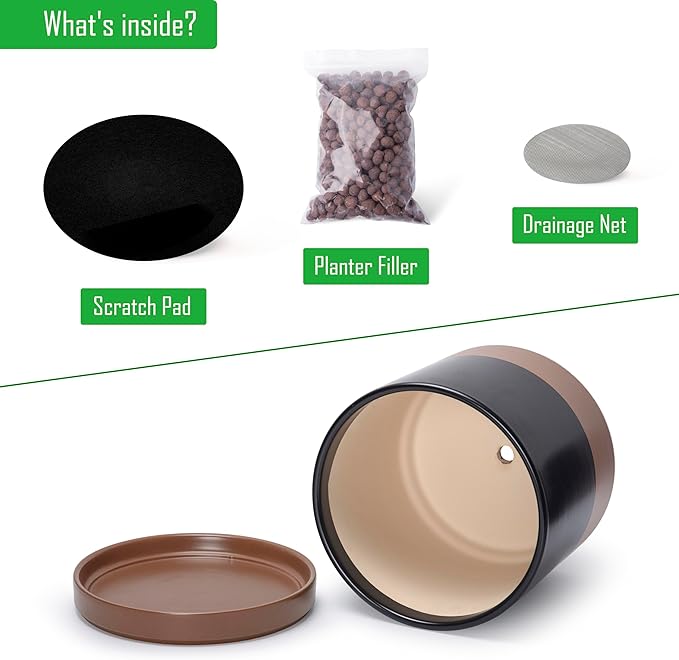 - Planter pot with drainage hole, mesh drainage net and protective scratch pad included.